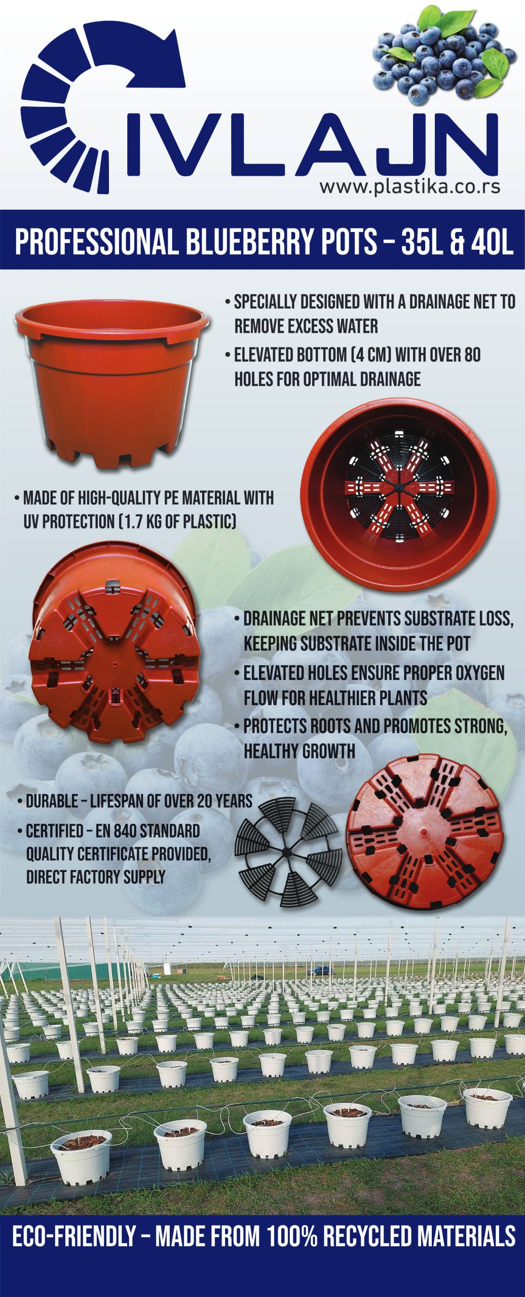 – Estimated lifespan of 10+ years. Grey colour with UV stabilisers reduces heating in the sun. When you transplant after 5–7 years, you can return the pots for the same value.